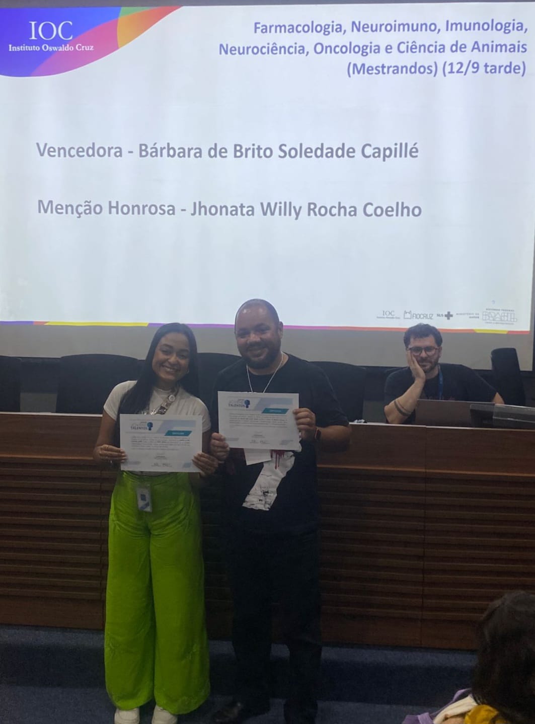 Os alunos do MPCAL Bárbara de Brito Soledade e Jhonata Willy Rocha Coelho foram reconhecidos na Jornada de Jovens Talentos IOC/Fiocruz 2025 com o prêmio de Melhor Trabalho e Menção Honrosa, respectivamente, na área de Farmacologia, Neuroimunologia e Ciências em Animais de Laboratório.